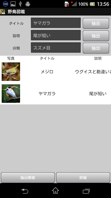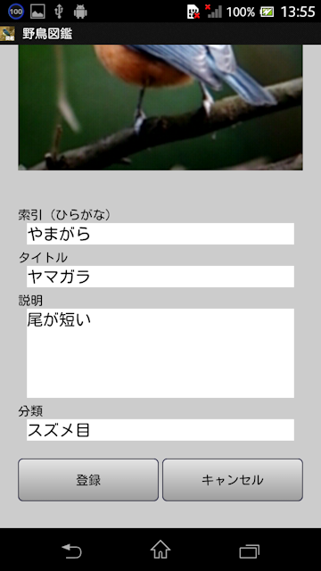 ■はじめに 野鳥図鑑は自分で作る図鑑シリーズ野鳥編です。 写真撮影、索引、タイトル、説明、分類が登録出来ます。 バックアップ機能も搭載しています。 ①アプリケーション最初の画面です。