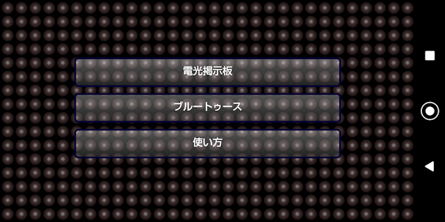 ■はじめに この「電光 Bluetooth」は端末同士をBluetoothで繋いでメッセージが送れます。 また、色の変更、速度の変更が出来ます。 ①アプリケーション最初の画面です。 ![]()