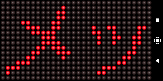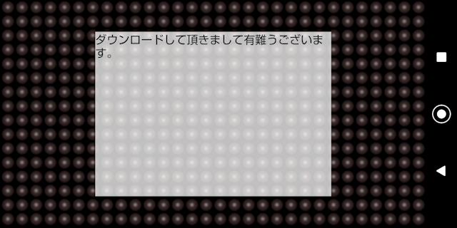■電光掲示板 ②電光掲示板を選択は従来のアプリと同じです。 電光掲示板の様にスクロール表示する事が出来るアプリです。 表示画面をタップすると開始します。 表示中にタップすると色が変わります。 表示中にスライドすると スクロール速度が変わります。 左向きはハイ、右向きはスロー 10段階変化します。 表示中に画面長押しは テキスト入力画面へ戻ります。 ![]()