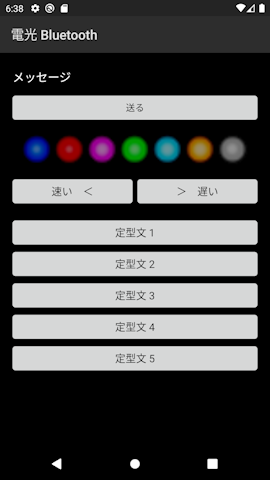■コントローラー側 ⑦エディットボックスにコメント入れ、送るボタンをタップすると⑧ディスプレイ側に表示すると思います。 色の変更もLED上をタップすることで可能です。 スクロールスピードの変更も可能で速い、遅いボタンをタップして下さい。 定型文ボタンをタップすることで定型文の送信が出来ます。(定型文の編集は定型文ボタン長押し) ![]()