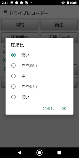 ■圧縮保存 ④圧縮保存ボタン 圧縮比を選択して保存出来ます。 低い → 高い 約3分の1のファイルサイズ 5分録画モード追加に伴い、バックグラウンドで作業する様に変更しました。 ![]()
