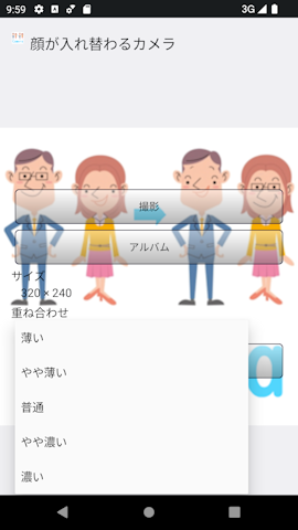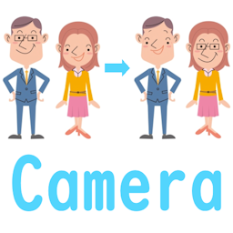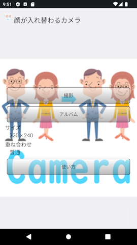 ■はじめに この顔が入れ替わるカメラは顔を認識して顔が自動で入れ替わるカメラアプリです。 顔の認識は最大10人(機種により増減します。)でシャッフルも出来、気に入った画像が出来ましたら保存してください。 画像① アプリケーション最初の画面です。