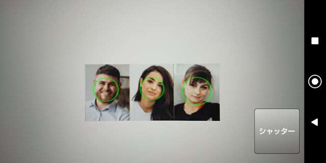 ■撮影 ②撮影はシャッターボタンをタップするだけです。 顔を認識すると円で囲みます。 円の真ん中に顔が有る時がシャッターチャンスです。 ![]()