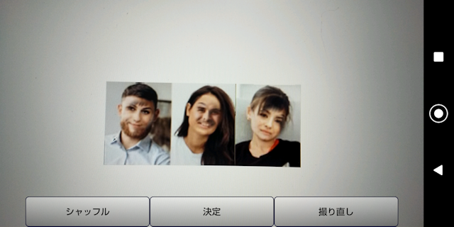 ■写真 ③気に入った写真が撮れたなら決定ボタンをタップして下さい。 シャッフルで顔の入れ替えが出来ます。気に入れば決定ボタン 良いのが無ければ撮り直しボタンをタップして再度撮影して下さい。