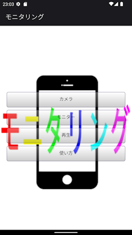 ■はじめに モニタリングは無線LANを介してカメラ映像を見ることが出来るアプリです。 2台の端末を利用して、一方をカメラ、もう一方をモニターに設定します。 ①アプリケーション最初の画面です。