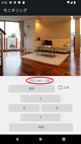 ■モニター ③接続ボタンをタップするとカメラ側の映像が映し出されます。 接続ボタンをタップしても繋がらないときは一度戻ってから再度試してください。 チェックボックスにチェックを入れると広角に切り替わります。 上下左右のパンも出来ます。 録画も可能です。