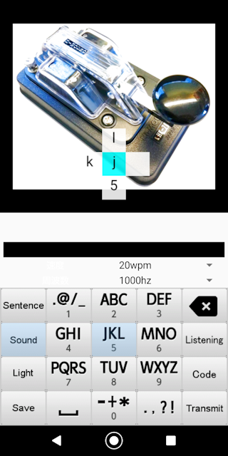 ■モールスプロセッサー2 ②送信画面 各ボタンの説明 Sentence ONにすると文字列が作れます。 Sound ONにするとモールス音が出力出来ます。速度、周波数の選択が出来ます。 Light ONにするとモールスをフラッシュ出力出来ます。速度は10wpmの固定です。 Save SDカード内にモールス信号のWAVファイルが保存出来ます。 Backspace 文字列が削除出来ます。 Listening ONにすると聞き取りテストが出来ます。正解はピンポーン、不正解はブブーと音が鳴ります。 Code ONにすると目でも確認できます。 Transmit Sentenceで作った文字列の送信が出来ます。 ![]()