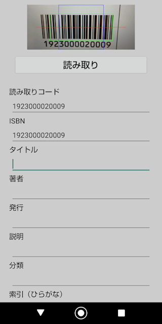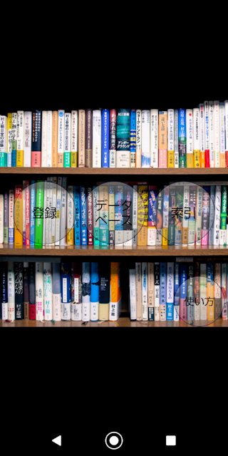 ■はじめに この「私の本棚」は簡易データベースを搭載している蔵書管理アプリ バーコードを読み取り各種データを登録出来ます。 索引から選び出したり、データベースから任意の文字で選び出したり出来ます。 写真の登録も出来ます。 ①アプリケーション最初の画面です。