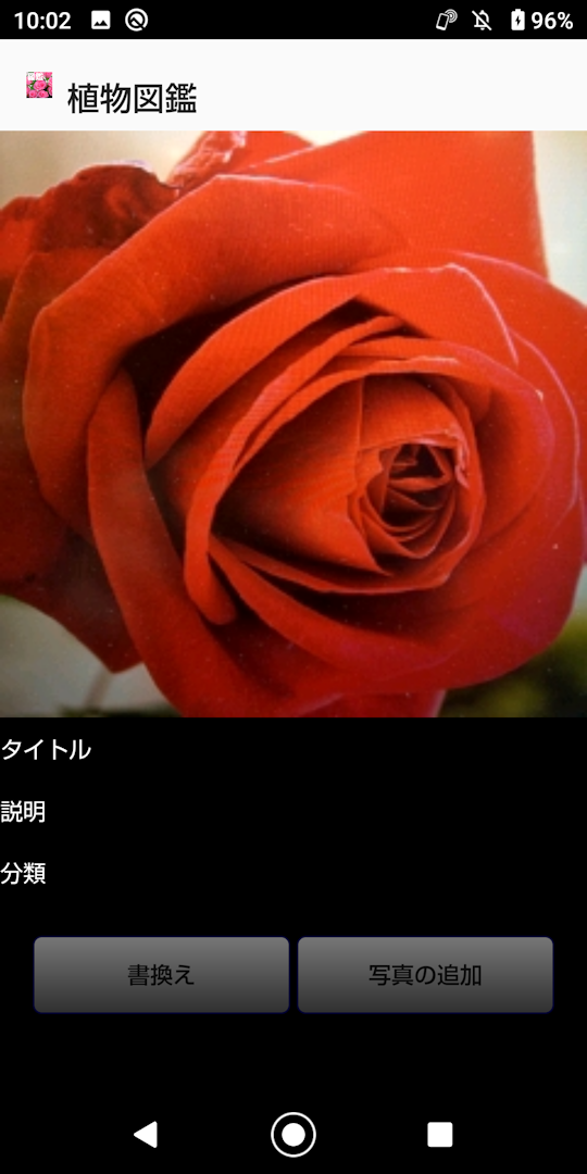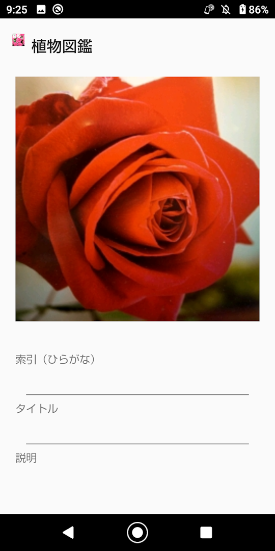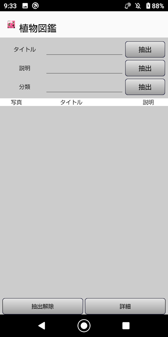 ■はじめに 植物図鑑は自分で作る図鑑シリーズ植物編です。 写真撮影、索引、タイトル、説明、分類が登録出来ます。 新機能バックアップを追加しました。 「使い方」を長押しして下さい。 ①アプリケーション最初の画面です。