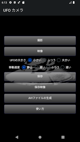 ■映像 ③撮影した映像の確認が出来ます。 UFOの大きさが選べます。 小さい、ふつう、大きいの3種類から UFOの移動速度が選べます。 停止、遅い、ふつう、早いの4種類から ![]()
