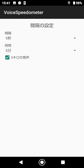 ■設定 ③設定画面 間隔 速度計測の間隔が設定出来ます。 時間 連続計測の時間が設定出来ます。 0キロの発声 チェックを外すと0キロ時は発声しません。 ![]()