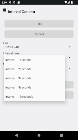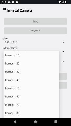 ■Introduction This "Interval Camera" is It is a camera dedicated to time-lapse photography that is very easy to handle. You can take time-lapse shots simply by setting the image size, interval time, and number of frames and tapping the shooting button. Equipped with a miniature effect function, you can create miniature-like videos. Since it can be saved as an AVI file, it can be imported to a computer and played back. ①This is the first screen of the application.