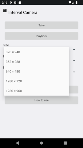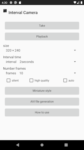 ■Introduction This "Interval Camera" is It is a camera dedicated to time-lapse photography that is very easy to handle. You can take time-lapse shots simply by setting the image size, interval time, and number of frames and tapping the shooting button. Equipped with a miniature effect function, you can create miniature-like videos. Since it can be saved as an AVI file, it can be imported to a computer and played back. ①This is the first screen of the application.