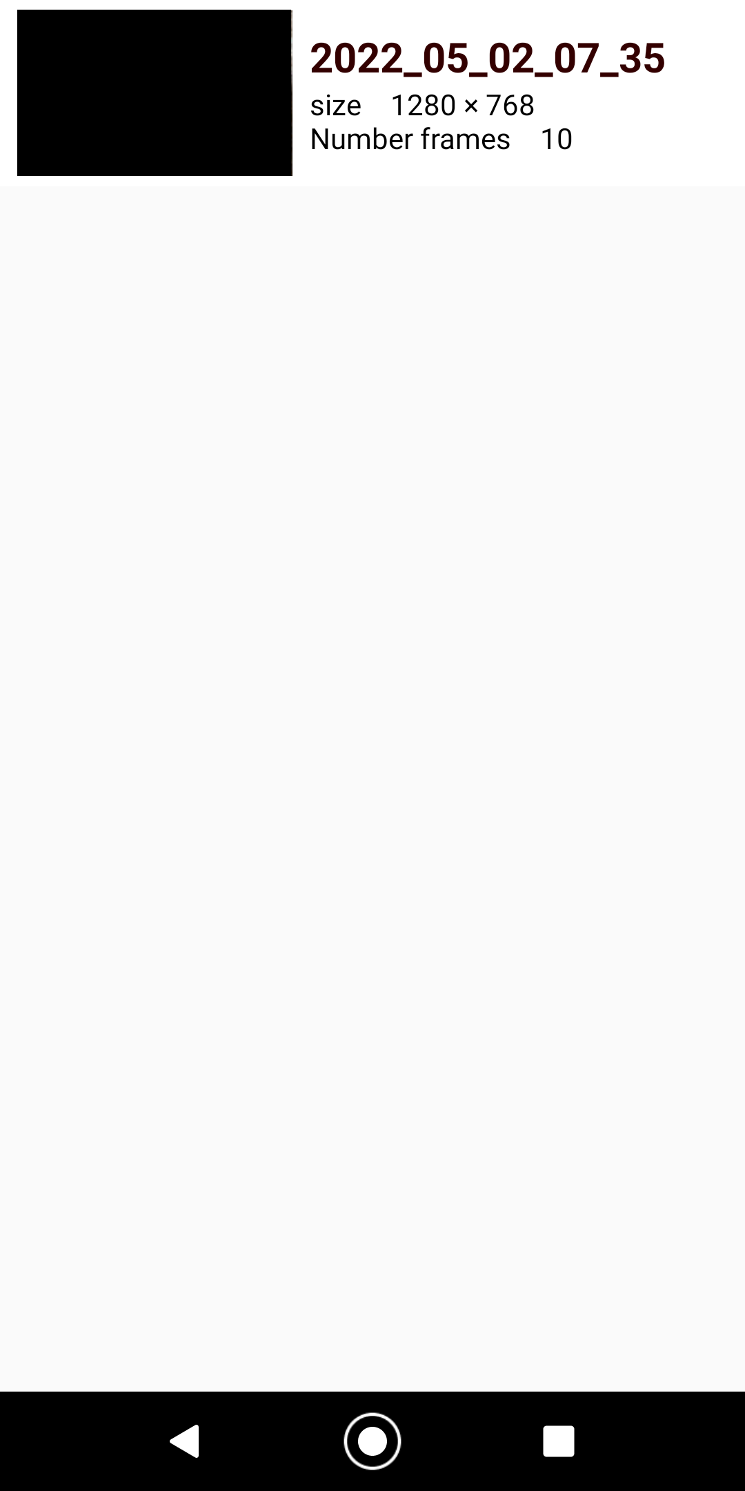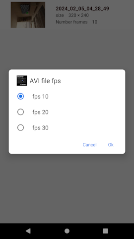 ■AVI file generation ⑨You can convert the saved video to an AVI file. Select the video you want to convert from the list and tap it. Long press to delete. ⑩You can set the fps of AVI files. (10fps, 20fps, 30fps)