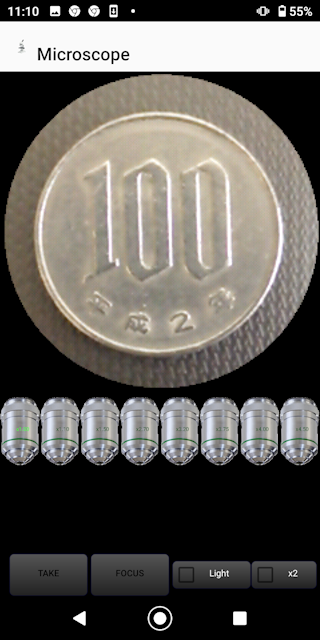 ■observation Tap the observation button. ②The magnification depends on the terminal, but the objective lens can be replaced. If you check the "Light" checkbox The light will come on. If you check the "x2" checkbox It will be an objective lens x2.
