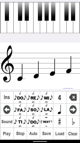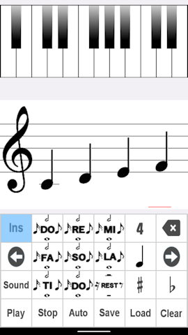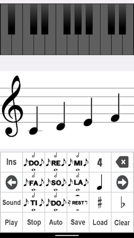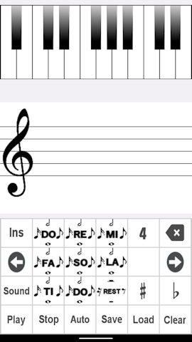 Sound When you tap the Sound button, the button turns light blue. There is a sound when inputting. Please tap again to cancel. Auto When you tap the Auto button, the button turns light blue. The score scrolls while playing. Please tap again to cancel. Play Play sheet music. Stop Stop playback. Clear Clear the music score. ♯ ♯ can now be entered. When you tap the ♯ button, the button turns light blue. Please tap again to cancel. ♭ ♭ can now be input. When you tap the ♭ button, the button turns light blue. Please tap again to cancel. note conversion Music notes can be easily converted. Move the cursor and flick the note button up or down. musical scale The scale has expanded. You can choose 3, 4, 5 Please flick the scale button up or down. Save ⑧Data storage You can save the created score with a name. ![]()