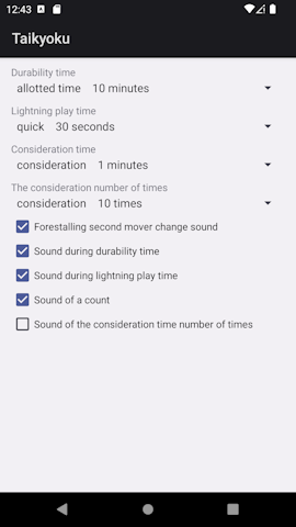 ■setting ③Settings screen No time limit Time limit: 5 minutes Allotted time: 10 minutes Allotted time: 20 minutes Allotted time: 30 minutes Allotted time: 45 minutes Allotted time: 60 minutes Quick pointing time 10 seconds Quick pointing time 20 seconds Quick pointing time 30 seconds Quick pointing time 40 seconds Quick pointing time 50 seconds Early indication time 1 minute Consideration time 30 seconds Consideration time 1 minute Consideration time 1 minute 30 seconds Consideration time 2 minutes Consideration time 3 minutes Number of considerations None Number of considerations 1 time Number of considerations 2 times Number of considerations 3 times Number of considerations 4 times Number of considerations 5 times Number of considerations 6 times Number of considerations 7 times Number of considerations 8 times Number of considerations 9 times Number of considerations 10 times 1st move 2nd move switching sound audio during time Audio during quick pointing time voice of the count Audio of the number of times to consider ![]()